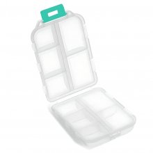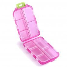 This box holds 10 different pills, securely snapping closed and locking in place when folded over.